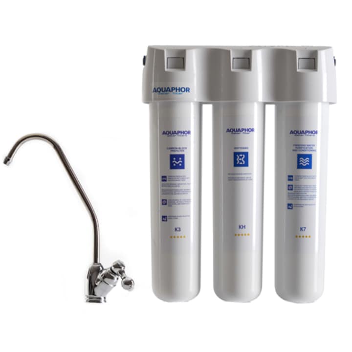 Filtru cu trei etape de filtrare este dotat cu robinet separat pentru apa pura cu ventil din ceramica. Cartusele K3 si K7 sunt confectionate din carbune activ de cocos, argint si Aqualen dupa tehnologia “carbon-block” de 5 si 0.8 microni respectiv.  Cartusul din mijloc KH contine rasina schimbatoare de ioni pentru dedurizarea apei. Elimina din apa clorul, metale grele, fenol, benzol, substantele organice si dedurizeaza apa.
